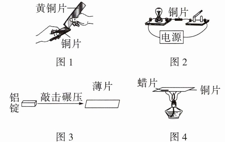 ,证明合金的硬度比纯金属大。(2)图2实验,闭合开关,灯泡发光,说明铜片具有