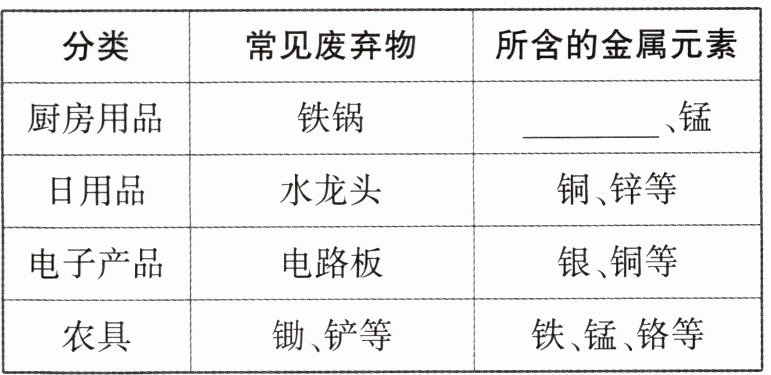 (1)下表是同学们调查的生活中常见废弃物及其所含的金属元素,请你一同完成。