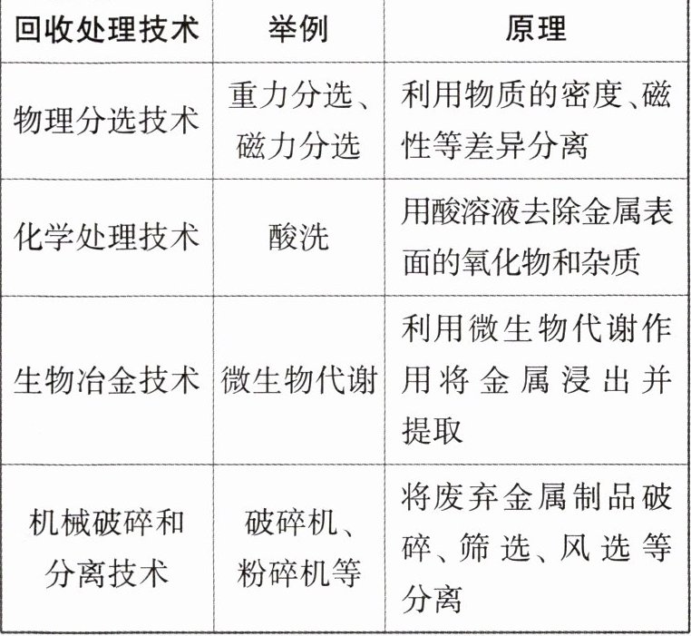 (6)生物冶金技术,优点:环保友好,减少化学试剂的使用;缺点:反应速度慢,微生物生长与代谢容易受环境影响(或化学处理技术,优点:高效分离与提取,适用范围广;缺点:化学试剂消耗大且污染环境等,合理即可)