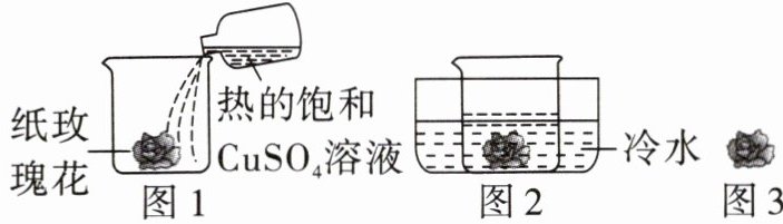 10. 趣味实验 制作蓝色玫瑰花 同学们在实验课上利用硫酸铜制作蓝色玫瑰花。先将热的硫酸铜饱和溶液倒入放有纸玫瑰花的烧杯中(图1),后将烧杯放在冷水中一段时间(图2),最终制得蓝色玫瑰花(图3)。下列说法不正确的是 (