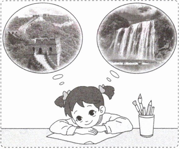 观察图片,小女孩的愿望是什么? 她想去哪里? 她可能想到这些地方做什么?发挥想象,写一写。