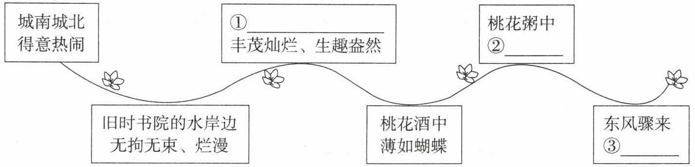 2. 示例:重读“迸”,该动词具有动态美,写出了桃花绽放时具有强大的生命力量,突出桃花的生机、烂漫,给人以震撼,表达作者对桃花具有强大力量的赞美。 3. 《桃花庵歌》记述了桃花庵中桃花仙人尽情享受生活乐趣,不顾他人嘲笑仍自得其乐的经历,表现了唐寅尽管贫穷却悠闲自得,与上文桃花中蕴含着人间盎然生趣相呼应,给文章增添了文化韵味和诗意。 4. ①“韶华”意为美丽的春光,与春日桃花盛开时的明丽烂漫、生趣盎然相符合。春光中煮桃花粥、酿桃花酒等亲近自然、享受春光的活动,体现了人在自然中获得心灵的释放,同时表明了珍惜眼前美好时光,尽情享受生活这一人生态度。②“韶华”还比喻美好的青年时代。“韶华盛”意味着尽管韶华易逝,我们却无须感时伤怀,而应以乐观、洒脱的态度把握当下,留住那韶华极盛时的美好记忆。