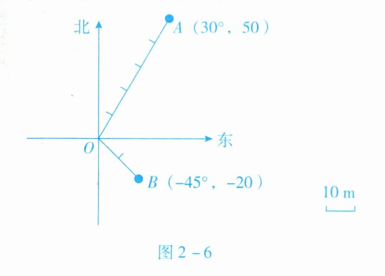 15. 如果规定北偏东 $ 30 ^ { \circ } $ 的方向记作 $ 30 ^ { \circ } $,从点 O 出发沿这个方向走 50 m 记作 50,图 2 - 6 中点 A 记作 $ ( 30 ^ { \circ }, 50 ) $;北偏西 $ 45 ^ { \circ } $ 的方向记作 $ - 45 ^ { \circ } $,从点 O 出发沿着该方向的反方向走 20 m 记作 $ - 20 $,图 2 - 6 中点 B 记作 $ ( - 45 ^ { \circ }, - 20 ) $.