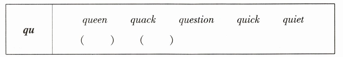 二、正确朗读下列单词,体会字母组合 qu 在单词中的发音,再尝试写两个含有相同发音的单词