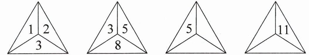 点拨:横着看,三角形内的左上角的数分别是1、3、5,后一个数都比前一个数多2;右上角的数分别是2、5、( )、11,后一个数都比前一个数多3;最下面的数都是同一个三角形内上面两个数的和,1+2= 3,3+5= 8。