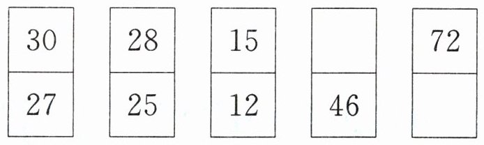 (1)上下观察这组数即可找到规律:每组数都是下面的数比上面的数少3。30-27= 3,28-25= 3,15-12= 3,那么46+3= 49,72-3= 69,所以接下来分别填49和69。