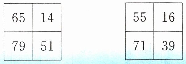 点拨:每个正方形内,左上角的数是85、75、65、( ),规律是后一个数都比前一个数少10;右上角的数是10、12、( )、16,规律是后一个数都比前一个数多2;左下角的数都是上面两个数的和;右下角的数都是上面两个数的差。