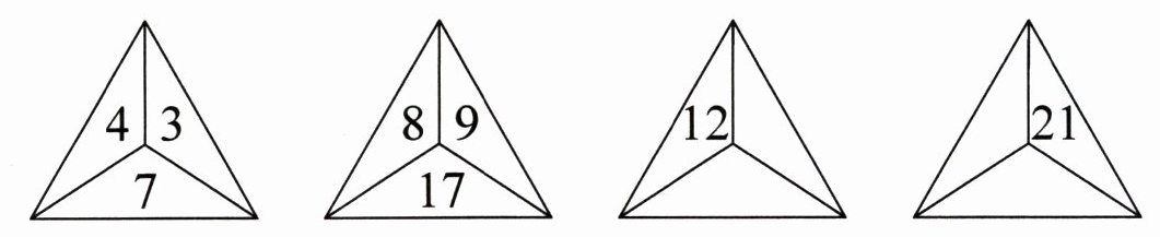 提示:每组中左上角的数依次加4,右上角的数依次加6;最下面的数是上面两个数的和。