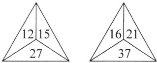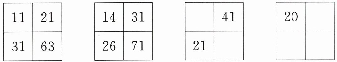 提示:每组中左上角的数依次加3,右上角的数依次加10;左下角的数依次减5,右下角的数是其他三个数的和。