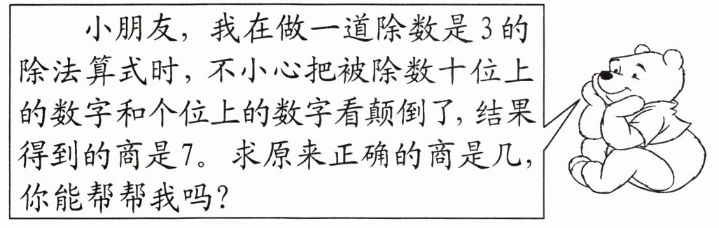 点拨:要求原来正确的商,只要求出正确的被除数即可。根据题意可求出在算错的情况下的被除数是$3×7 = $