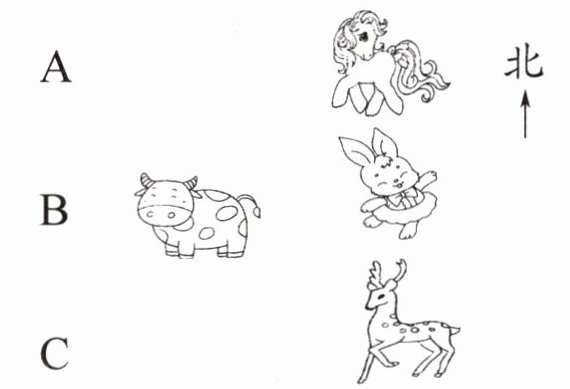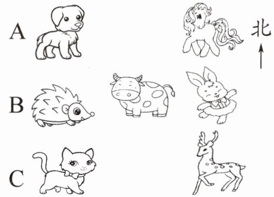 点拨:先明确方向,小牛的东面是小兔,西面是B,西北面是A,西南面是C,东南面是小鹿,东北面是小马。