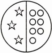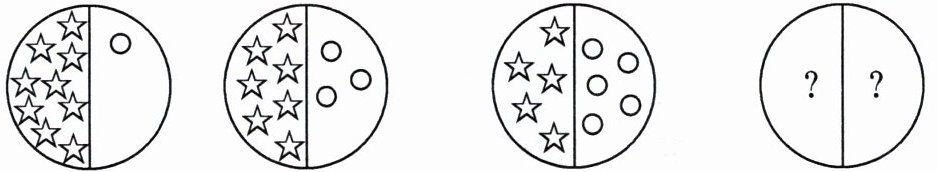 点拨:观察前面3幅图,每个圆都被分为左、右两部分。第1个圆中左边有9个☆、右边有1个○;第2个圆中左边有7个☆,右边有3个○,比第1个圆中少了2个☆,多了2个○;第3个圆中左边有5个☆,右边有5个○,又比第2个圆中少了2个☆,多了2个○。