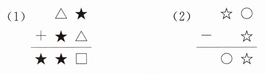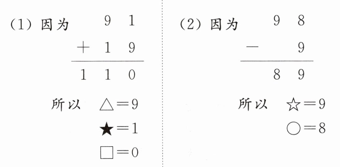 (2)这道减法算式被减数与差的个位和十位交换了位置,再看减数是一位数,综合这两个条件,说明☆与○相差甚少,因此☆是9,○是8。