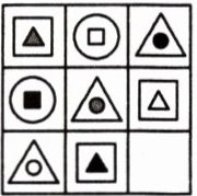 点拨:观察可知每个方格内的图形都是由里、外两个基本图形组成的,外面的基本图形分别是□、○、△;里面的基本图形分别是△、□、○,且基本图形内分别画阴影、空白、涂黑。同一行或一列中里面、外面的基本图形均不相同,所以第三行的空白处,外面应画○,里面应画■,即空白处应画◎。