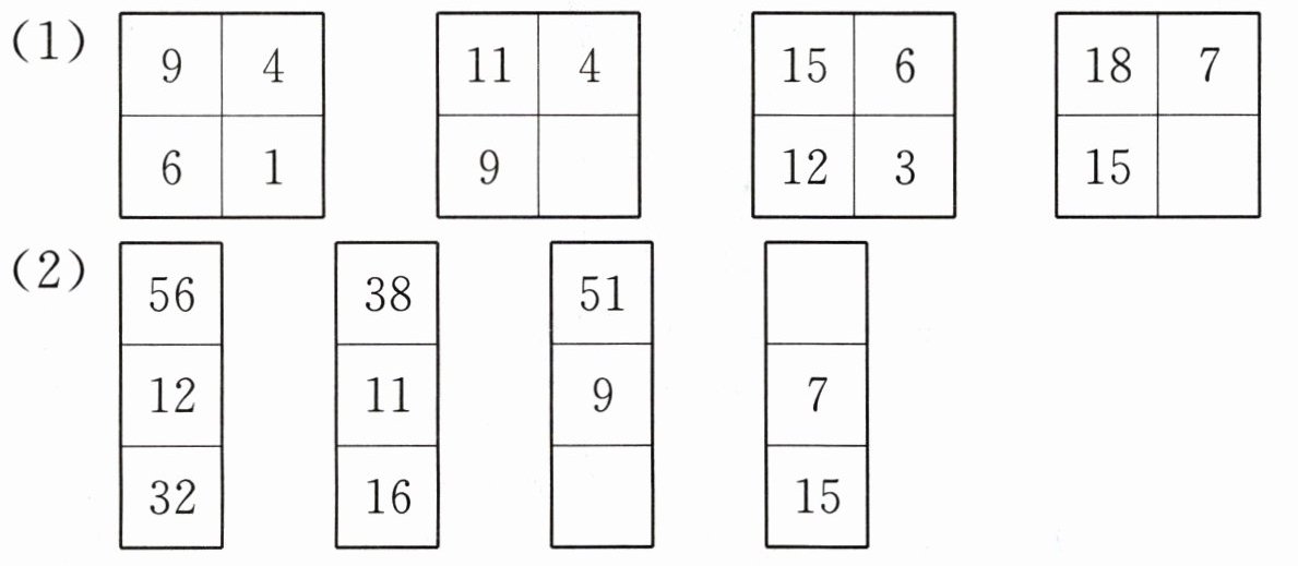 (2) 分析:规律是中间的数$×2+$下面的数=上面的数。$12×2+32=56$,$11×2+16=38$,$51-9×2=33$,$7×2+15=29$。解答:33 29