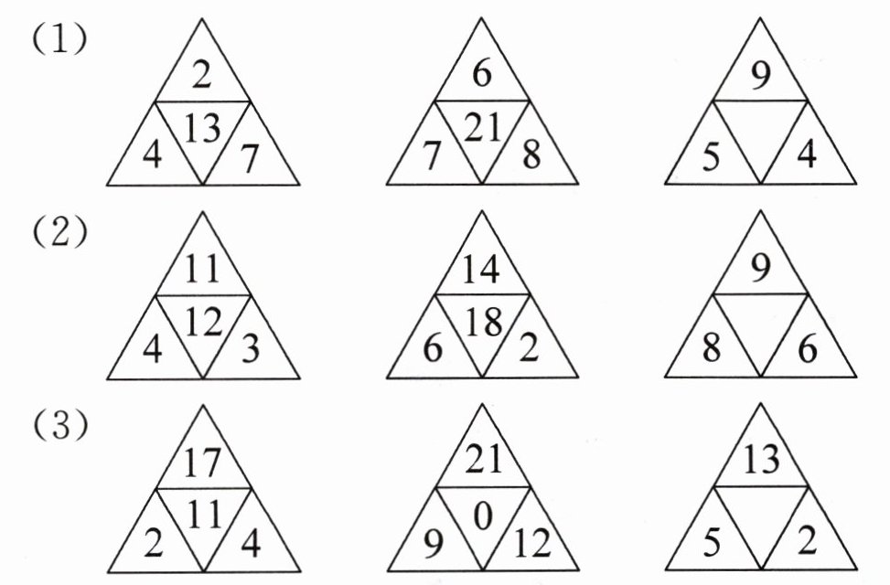 (3) 分析:规律是最上面的数-左下角的数-右下角的数=中间的数。$17-2-4=11$,$21-9-12=0$,$13-5-2=6$。解答:6