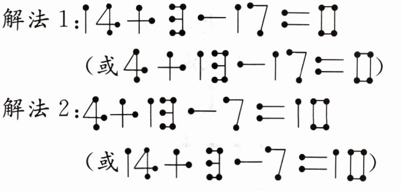 点拨:这个算式左边的计算结果是20,比右边多20。为了使两边相等,可以移动1根火柴棒使左边两个加数减少10,让减数增加10,这样左边一共减少了20,等式就成立了。也可以这样想:从左边拿出多的一个10,放到右边。