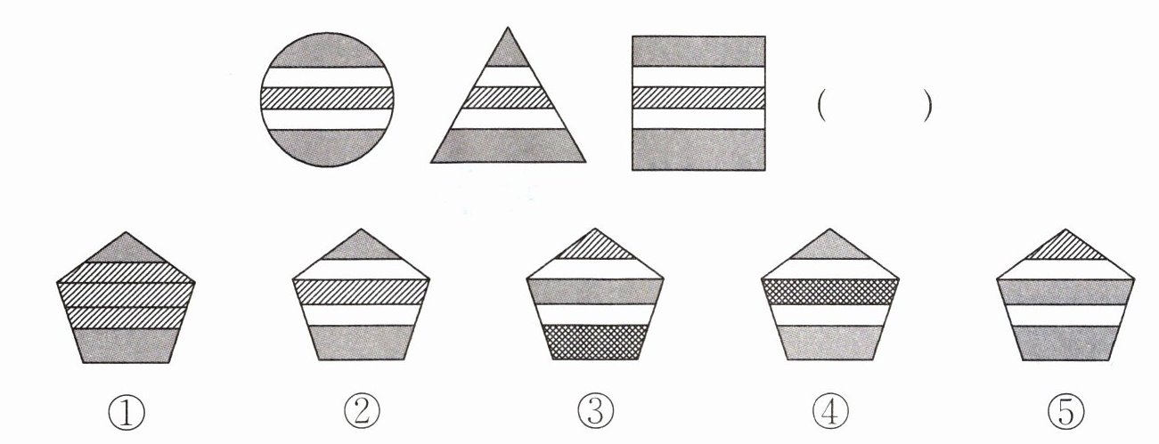 观察图形可知,每个图形均分成5份,中间部分为斜阴影,上、下两部分为涂色,其余部分是空白。符合此规律的图形为②。