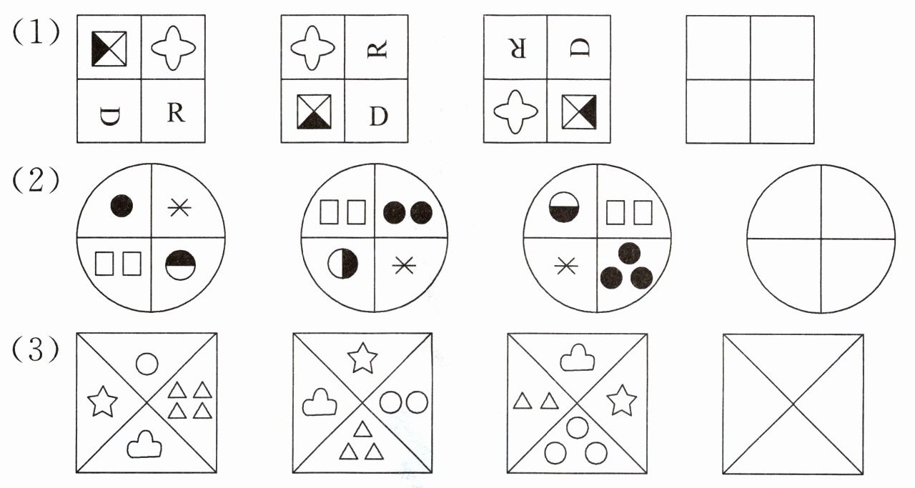 (1) 分析:我们来读图:1个黑三角形2个白三角形,2个黑圆3个白圆,3颗黑五角星4颗白五角星……也就是先黑后白,白的比黑的多1个,且后一种图形中黑的与前一种图形中白的一样多,由此推出黑正方形一共有4个,已经画出2个,所以我们要再补画2个。