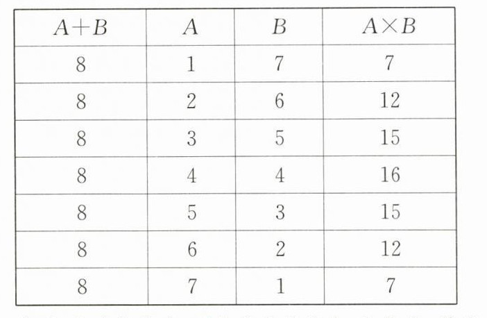 从表格中可以发现:和为定值时,两个数的差越大,积越小;差越小,积越大。所以当A、B都为4时,A×B的积最大。