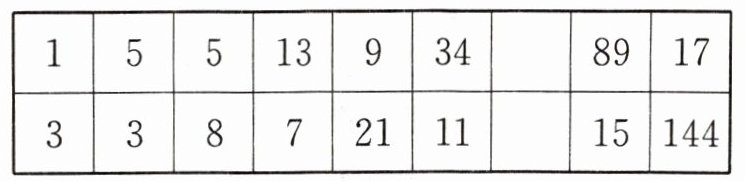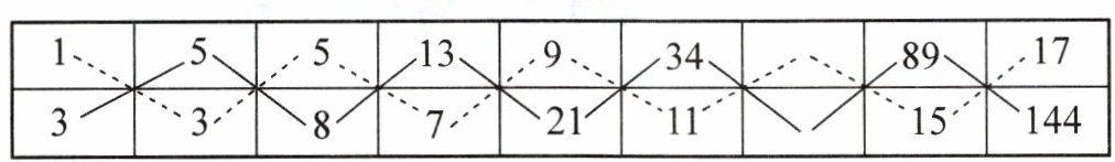 点拨:仔细观察每一行、每一列,发现无明显规律,且很杂乱。但是仔细分析,3、5、8、13、21……这些数之间又存在着我们以前学过的“往后每个数等于前两个数的和”这一规律,将这些数连接起来看,很快发现了两个规律。(见下表)