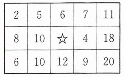点拨:仔细观察每一行、每一列,发现无明显规律;将每一列三个数再分析,发现第二行的数等于相应的第三行与第一行数的差的2倍。如:$(6-2)×2= 8,(10-5)×2= 10,(9-7)×2= 4,(20-11)×2= 18,$根据这个规律可以求出☆是什么数字。