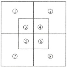 由1个编号形成的正方形:③、④、⑤、⑥共4个;由2个编号组成的正方形:①+③、②+④、⑤+⑦、⑥+⑧,共4个;由3个编号组成的正方形:0个;由4个编号组成的正方形:③+④+⑤+⑥,共1个;由5、6、7个编号组成的正方形都是0个;由8个编号组成的正方形:①+②+③+④+⑤+⑥+⑦+⑧,共1个。
