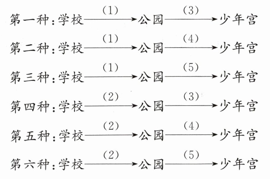 从列举可以发现,小华从学校经过(1)到公园,再到少年宫有 3 种走法;从学校经过(2)到公园,再到少年宫也有 3 种走法,共有 6 种走法。