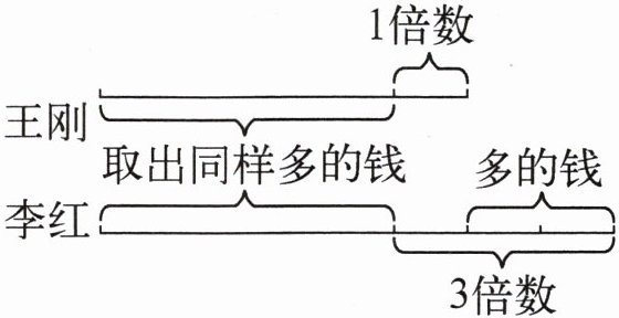 从图中可以看出,由于两人取款数相同,所以两人的存款差不变,还是相差6400-4800= 1600(元)。取钱后,王刚的钱数是1倍数,李红的钱数就是3倍数,多出了2份,用差除以倍数之差就能得到1倍数,即王刚取款后的钱数。