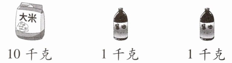 2. 1 袋大米重 10 千克,1 瓶酱油重 1 千克。1 袋大米和 2 瓶酱油重多少千克?
