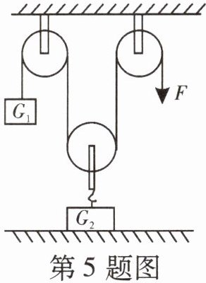 5. 如图所示,已知重物$G_{1}= 500\ N$,重物$G_{2}= 1200\ N$,在不考虑摩擦和其他阻力及滑轮重的情况下,使重物$G_{1}保持平衡的拉力F$为