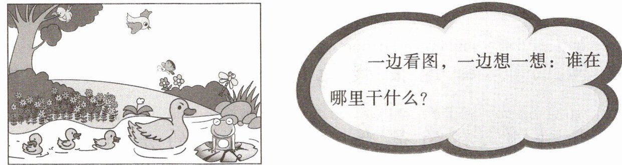 【解析】:先观察例子“蚯蚓(土里)(造宫殿)”,可知结构是“动物(地点)(做什么)”。再看插图,图中小鸭在水里游,所以第一题可以是“小鸭(水里)(游来游去)”。图中还有青蛙在荷叶上唱歌,小鸟在树上唱歌,蝴蝶在花丛中飞舞等,第二题可选青蛙,即“青蛙(荷叶上)(唱歌)”(答案不唯一,合理即可)。