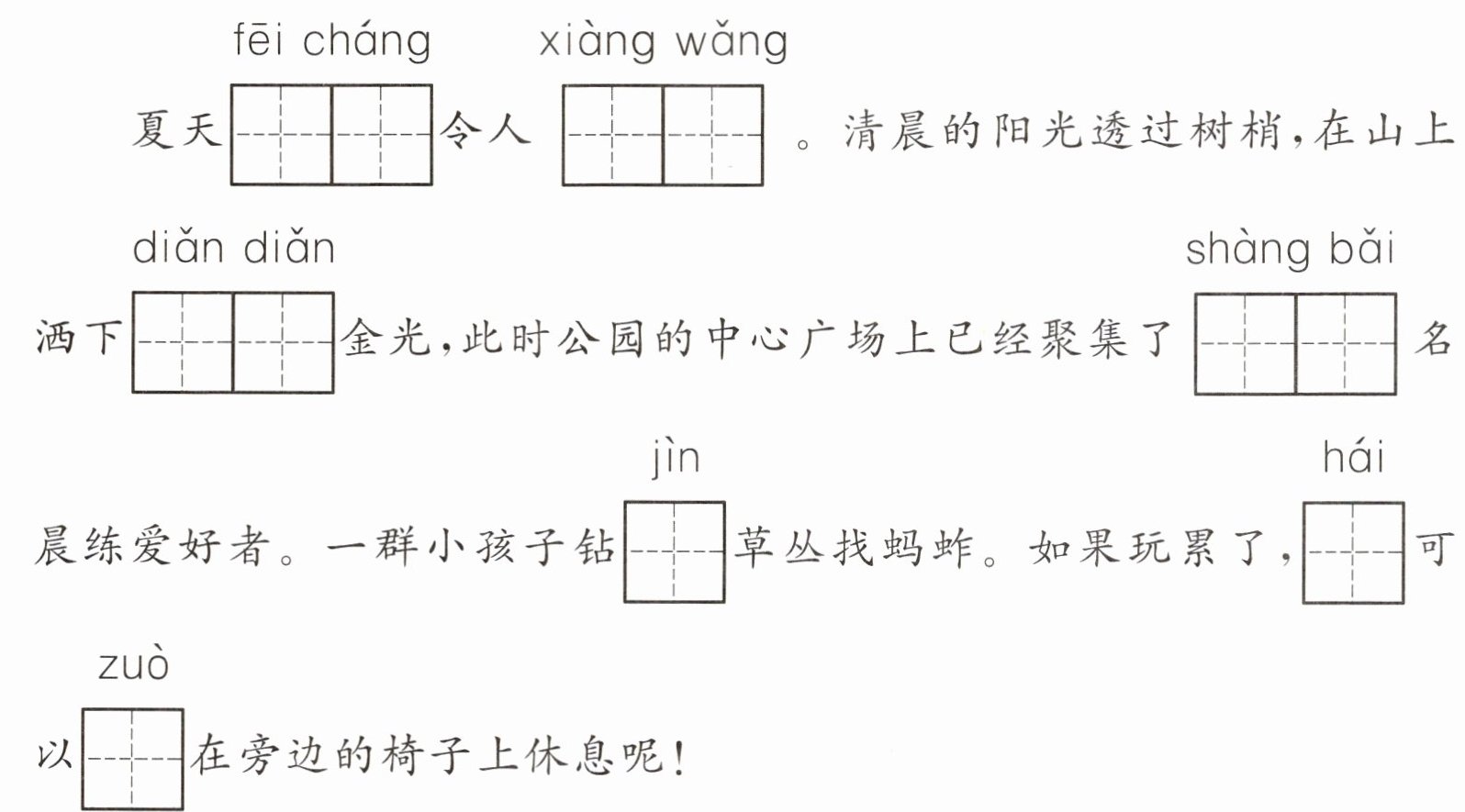 【解析】:对于“人”和“入”,“进入”是常用搭配,所以“进”后应填“入”;“人民”指以劳动群众为主体的社会基本成员,所以“民”前应填“人”。“元”和“无”,“有无”表示存在或不存在,所以“有”后填“无”;“元旦”是新年第一天,所以“旦”前填“元”。“午”和“牛”,“水牛”是一种牛的品种,所以“水”后填“牛”;“中午”指白天十二点左右的时间,所以“中”后填“午”。“汽”和“气”,“汽车”是一种交通工具,所以“车”前填“汽”;“气球”是充满气体的玩具,所以“球”前填“气”。