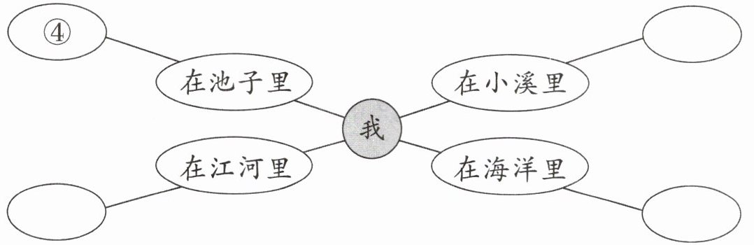 【解析】:本题考查对不同水域水流状态的联想与匹配。思维导图中心是“我”,结合常见水域特点分析:池子水流平缓,对应“④睡觉”(已给出示例);小溪水流轻柔缓慢,像“①散步”;江河水流速度较快,如同“③奔跑”;海洋广阔且有波浪、潮汐等多种动态,对应“②跳舞,唱歌,开大会”这种丰富的动态描述。