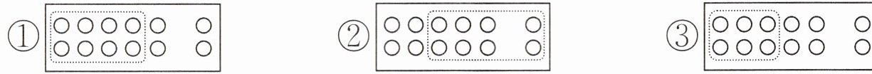 【解析】:小雪计算$12 - 8$时把12分成10和2,这是“破十法”的思路,即先算$10 - 8 = 2$,再算$2+2 = 4$。观察图形,需要找到先从10个物体中去掉8个的图。图①中虚线框住了10个(上面5个下面5个),符合把12分成10和2后,先对10进行操作的思路;图②虚线框住的数量不是10,图③虚线框住的是6个,均不符合。
