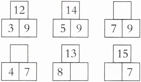 【解析】:观察前两组图形,上面的数字等于下面两个数字之和,即: