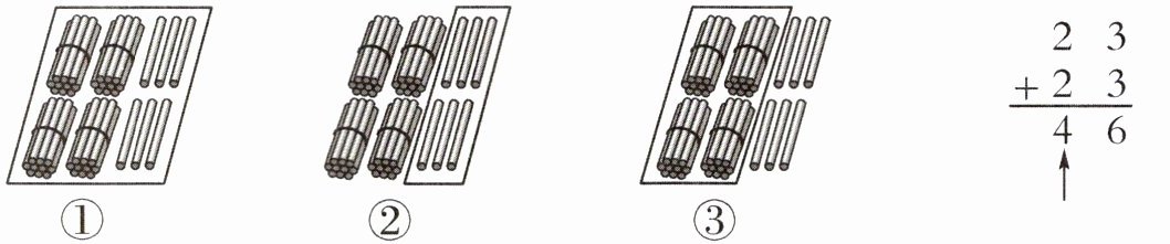 【解析】:在竖式计算$23 + 23$时,“↑”所指的“4”在十位上,表示4个十。$23$中的“2”在十位,表示2个十,两个$23$的十位数字相加为$20+20 = 40$,即4个十。小棒图中一捆小棒代表1个十,4个十就是4捆小棒。图①中有4捆小棒和6根单根小棒,代表$46$,是计算结果;图②中上面部分有2捆和3根,下面部分有2捆和3根,分开呈现了两个加数;图③中清晰地展示了4捆小棒,正好对应十位上的4个十。