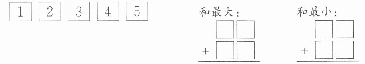 【解析】:要使两个两位数的和最大,应将较大的数字放在较高的数位上。五张卡片中最大的两个数字是5和4,分别放在两个两位数的十位上;剩下的较大数字3和2放在个位上,1无法使用(题目可能存在表述误差,原竖式应为两个两位数相加,使用4张卡片,最大和为53+42=95或52+43=95)。要使和最小,将较小的数字1和2放在十位上,3和4放在个位上,和为13+24=37或14+23=37。