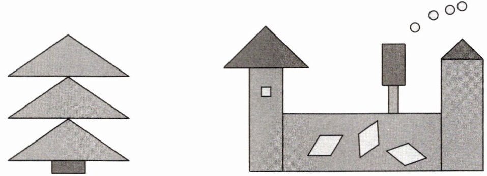 三角形:左侧图形是由3个三角形组成的树;右侧图形中小房子顶部是1个三角形,右侧柱子顶部是1个三角形,因此三角形共有3+1+1=5个。