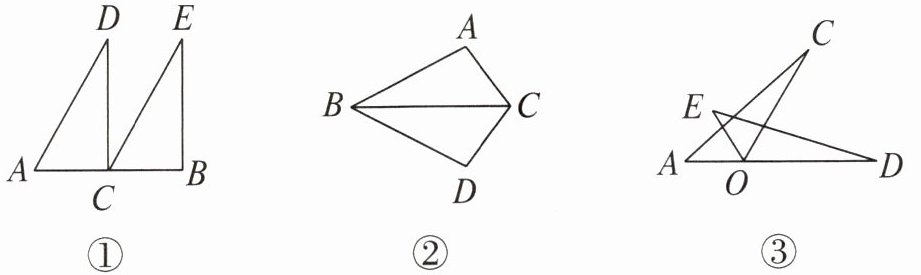 (2)先将$\triangle ABF$沿着直线$BC$平移,使点$F$与点$E$重合,再将此三角形绕着点$E$逆时针旋转$180^{\circ}$,便可得到$\triangle DCE$。(答案均不唯一)