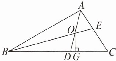 2. 如图,在 $ \triangle ABC $ 中, $ \angle ABC = \alpha $, $ \angle ACB = \beta $, $ \alpha < \beta $, $ AD $, $ BE $ 分别是 $ \angle BAC $, $ \angle ABC $ 的平分线,且 $ AD $, $ BE $ 相交于点 $ O $,过点 $ O $ 作 $ OG \perp BC $, $ G $ 为垂足,则 $ \angle DOG = $(