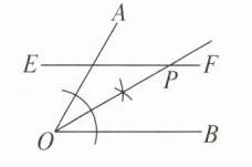 14. 某市大力推广乙醇汽油,交警加强了监管力度。如图,点$O$是一个加油站,$OA$,$OB$是通往加油站的两条公路,$EF是与OB$平行的另一条公路,为了保证交警能对经过这三条公路的每辆车进行检查,准备在公路$EF$上建一个值班室,要求值班室到公路$OA$,$OB$的距离相等,请你作出值班室$P$的位置(尺规作图,不写作法,保留作图痕迹)。