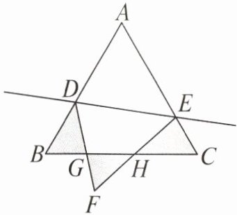 2. 如图,△ABC 是等边三角形,点 D 和点 E 分别是线段 AB,AC 上的点,作直线 DE,将△ADE 沿直线 DE 翻折,AD,AE 的对应线段 DF,EF 分别交 BC 于点 G 和点 H,当 AB = 4 时,阴影部分的周长是(