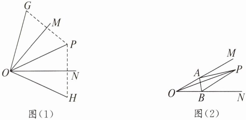 15. 已知点 P 在∠MON 内。如图(1),点 P 关于射线 OM 的对称点是 G,点 P 关于射线 ON 的对称点是 H,连接 OG,OH,OP。