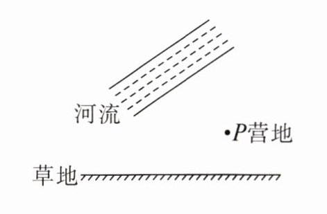 13. 如图,已知牧马营地在 P 处,每天牧马人要赶着马群先到河边饮水,再带到草地吃草,然后回到营地,请你替牧马人设计出最短的放牧路线。