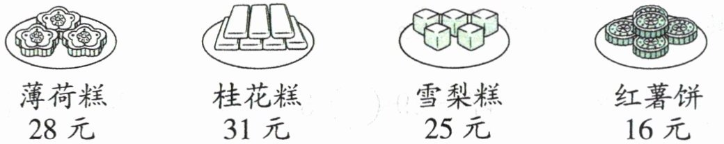 (1)要计算买两种不同糕点最少需要花的钱,需要找出价格最低的两种糕点。已知四种糕点价格分别为:薄荷糕28元、桂花糕31元、雪梨糕25元、红薯饼16元。比较价格大小:16元(红薯饼)<25元(雪梨糕)<28元(薄荷糕)<31元(桂花糕),价格最低的两种是红薯饼和雪梨糕,将它们的价格相加:16+25=41(元)。