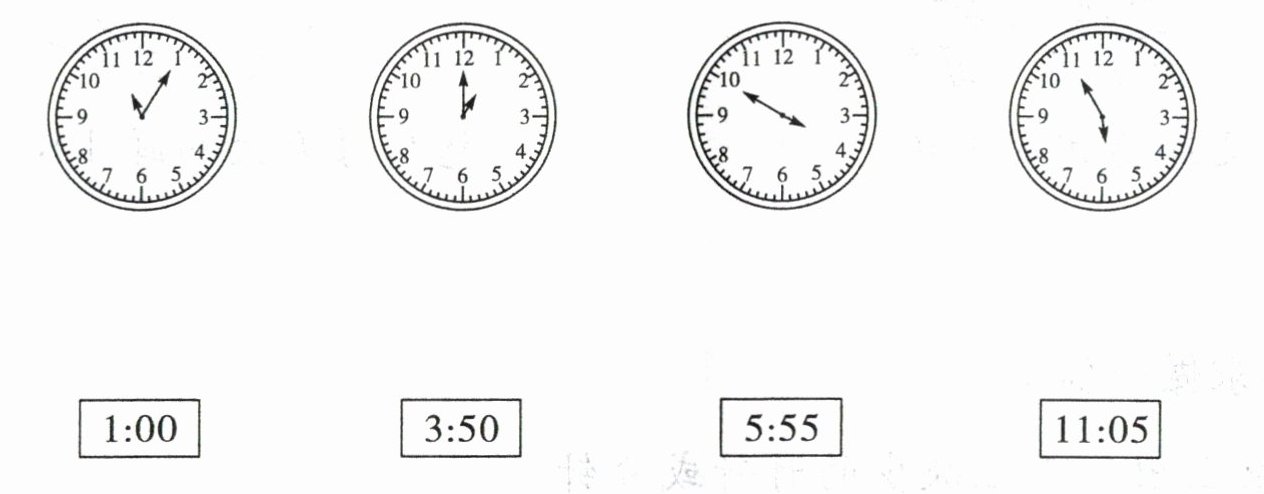 【答案】:第一个钟面连11:05,第二个钟面连1:00,第三个钟面连3:50,第四个钟面连5:55