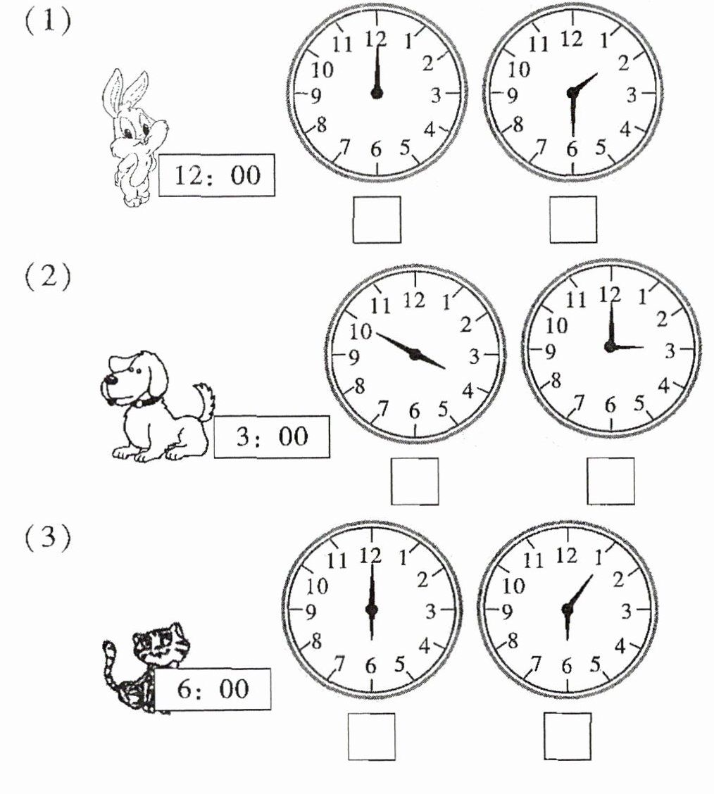 2. 根据给出的时刻找出正确的钟面,并画“√”。