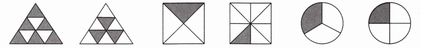 【解析】:第一个图是两个相同的大三角形,均被平均分成9个小三角形。左图涂色部分有6个小三角形,用分数表示为$\frac{6}{9}$;右图涂色部分有3个小三角形,用分数表示为$\frac{3}{9}$,因为$6>3$,所以$\frac{6}{9}>\frac{3}{9}$。