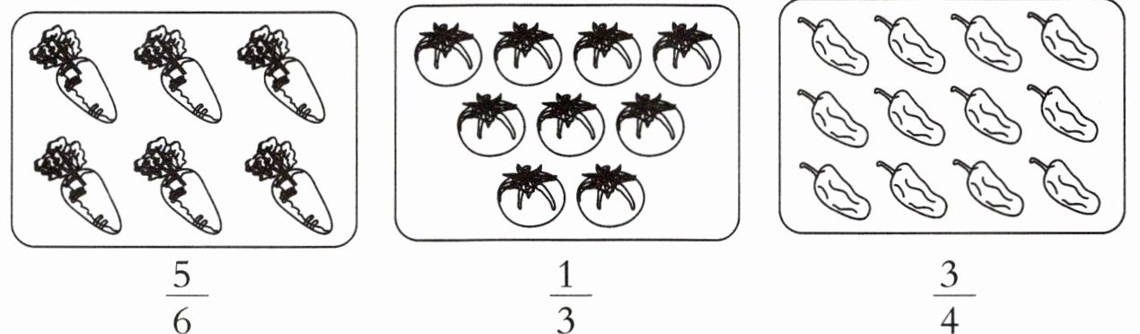 第三个图(辣椒,共12个):涂其中9个辣椒(12×3/4=9)。